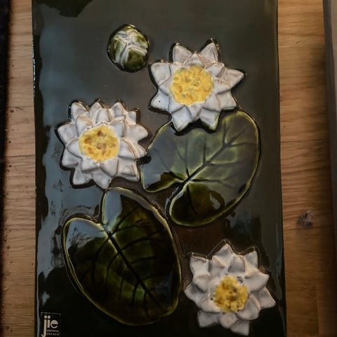 Vintage veggplatte med rosa blomster fra svenske Jie keramikk