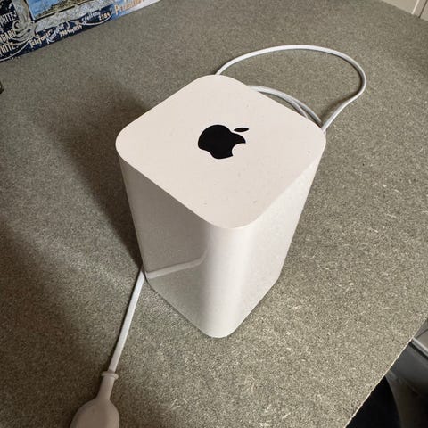 Apple, Airport Extreme, A1408, WiFi-router, trådløs ruter, basestasjon, nettverksutstyr, dual-band WiFi, 2.4GHz, 5GHz, Gigabit Ethernet, brukt, god stand, fungerer som den skal, komplett med strømforsyning, Mac, Apple-nettverk, home office, rask WiFi, stabil tilkobling