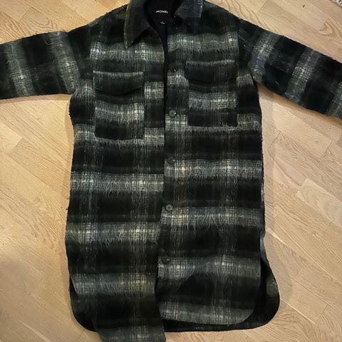 Tilstand? Pent brukt, men KRYMPET i ull og cashmerestoffet, viskosen i foret er derfor noe større enn ulla og henger litt ned i armer og på hem. (se bilder). Pris kraftig justert.