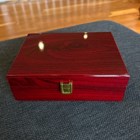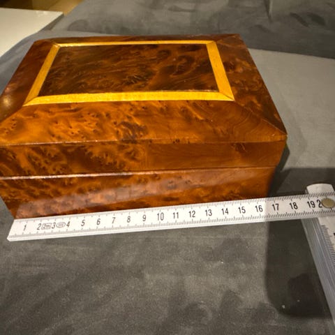 Stort skrin i massivt tre inndelt i 12 rom og glasslokk. Gir god oversikt over hva som er oppi. Fin til smykker eller hobbyartikler, knapper, sysaker etc. Solid