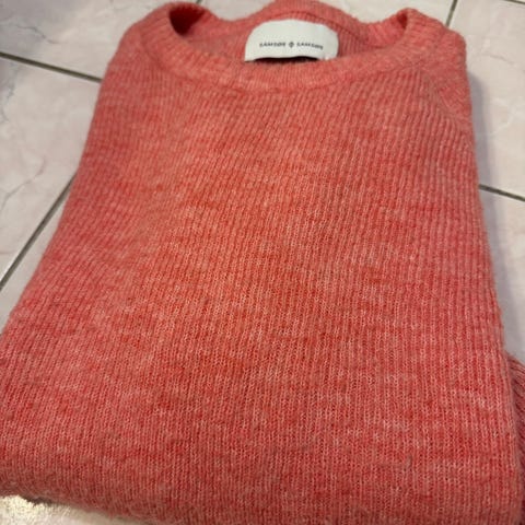 Fersken, korallfarget strikkegenser fra Iben. Modellen er Ethan boatneck. I small men føles større. 60% mohair og resten nylon.