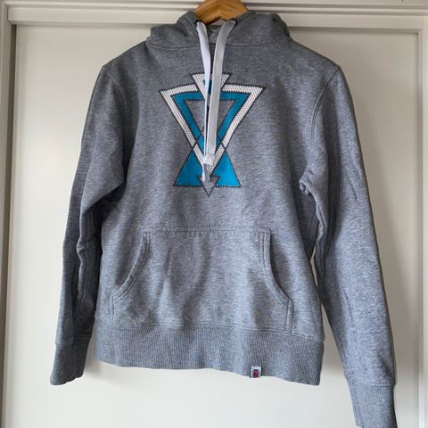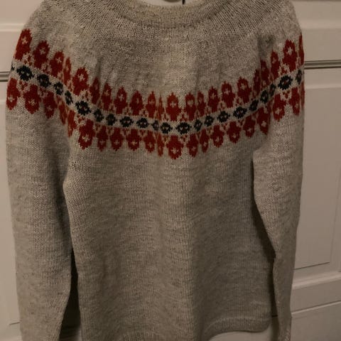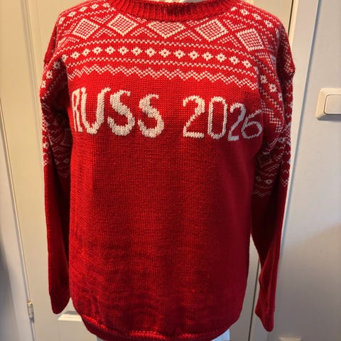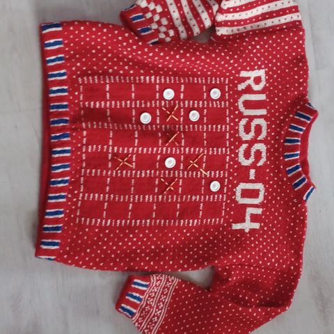 Selger en hjemmestrikket russegenser. Den ble brukt i 2004. Russ 04 er brodert på armen, slik at årstallet kan tas bort og erstattes med nytt. Russeluen som er sydd på den andre armen, er lomme som lukkes med en trykknapp. Pent brukt, ingen feil eller mangler. Str m.