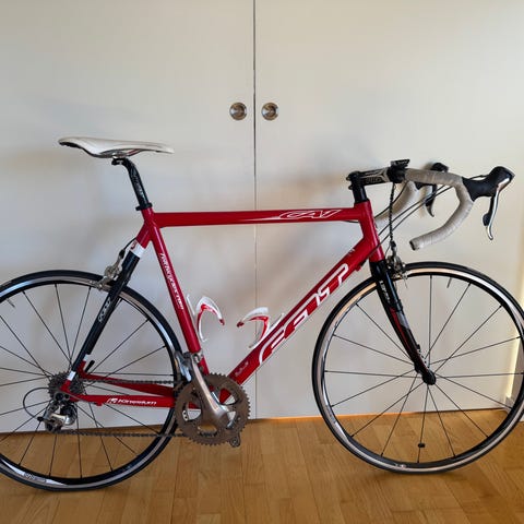 Ved første øyekast et ganske strøkent rammesett fra Cinelli, laget av Columbus Aluthron-rør (aluminium), med Campagnolo Athena kranklager og Ambrosio styrelager. MEN, det er to ting som gjør at jeg ikke har noen interesse av å beholde den selv: For det første kan man kan se en liten antydning til sprekkdannelse i styrerøret (jeg har prøvd å få fram dette på bildene). For det andre er venstre girkabeljusteringsskrue brukket, og sitter delvis igjen igjen i kabelstopperen på rammen (se bildene med brun tape).