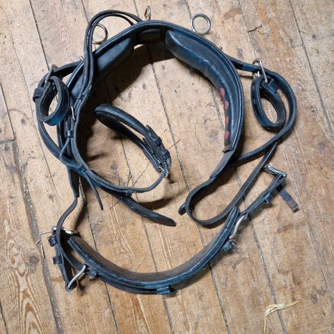 Pent brukt svart maratonsele i lær til ponni. Den er brukt på en kraftig shettis på 105 cm. Selen er brukt på innerste hull så det er endel å gå på. Kan følge med et rett muffebitt om ønskelig.