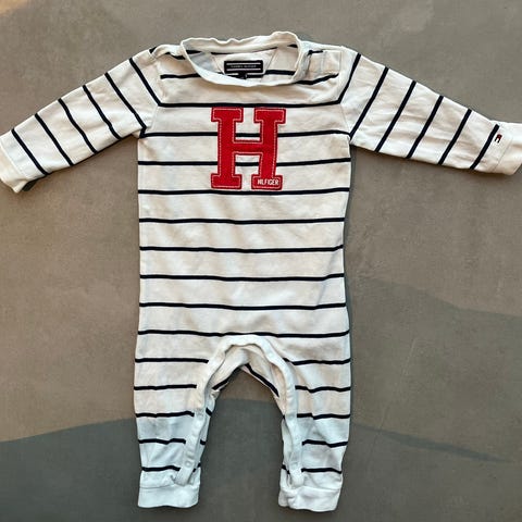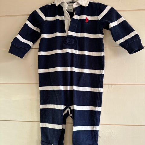 Pent brukt Ralph Lauren heldrakt / onepiece str 6 mnd, men litt liten i størrelsen. Så jeg har merket den som 62 cm. Den har et lite hull, som kan sys.