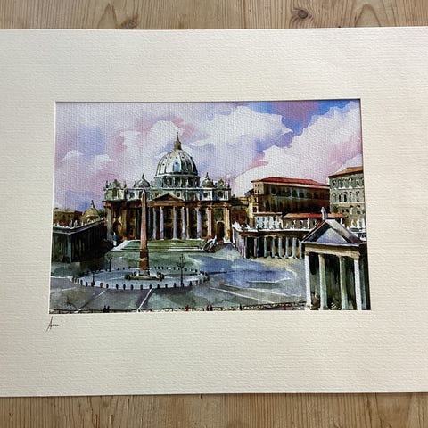 Vakker akvarell av San Pietro, Peterskirken i Roma selges. Signert. Størrelse 47 x 42 cm. Vintage. Arv. Kjøpt i Roma. Innrammet hos M. Andreassen, rammeverksted i Kirkegaten, Stavanger.