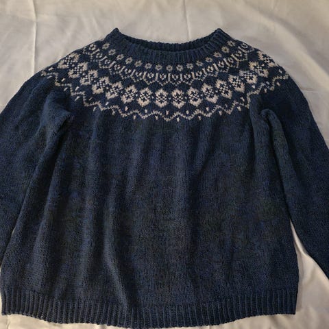 Mål ca 41 cm fra armhule til armhule. 37 cm lange ermer.