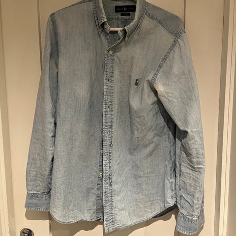 En sjelden jeansskjorte til salgs. Ermene er i camo stoff, mens resten i denim. Lite brukt og fremstår som meget pen.