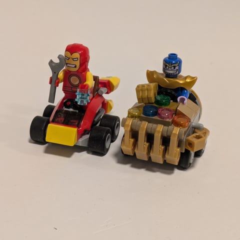 Spinjitzu-energi Kai, 2 stk Mighty Micros, 2 stk Lego technic. NB: mangler skjoldet til Captain America, og på lego tehnic er noen hvite deler noe misfarget.