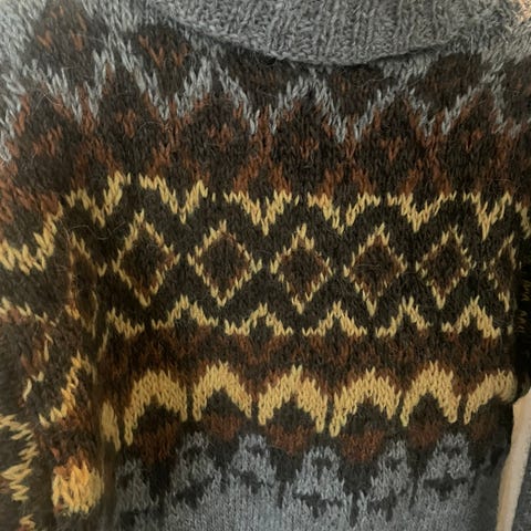 Kul, morsom og varm kjole fra legendariske Moods of Norway. Som alltid mange lekne detaljer som f.eks. stor krage med knapper, traktoren, og drink-glasset. Dette her er skikkelig blikkfang - og en varm, komfortabel kjole.