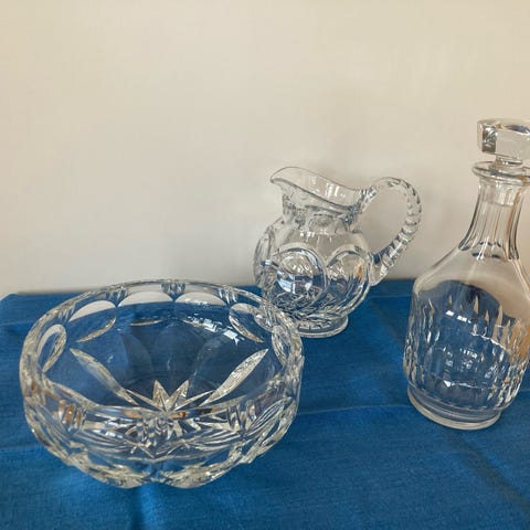 Kake/godteriskål i krystall, formet som en ørn. Fått fra et auksjonshus, vet ikke historien før det. Ett skår fra bunn av underdel, se bilde. Ellers i fin og pen stand.
