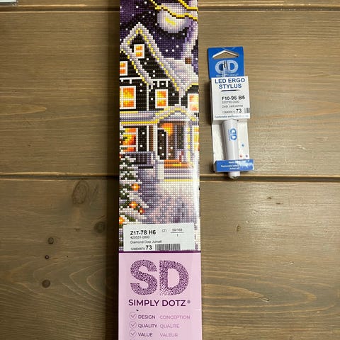 Selger en oppbevaringsboks med diamanter i ulike farger. Diamanten fulgte med et sett med diamond painting. En limpenn følger med.