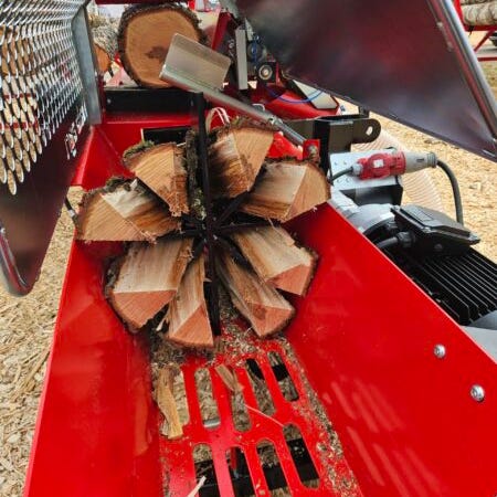Innmaterbånd + Utmaterbånd. Gjør alt ekstremt effektivt. Det følger med en 4-deler kniv + en 6-deler, alt etter størrelse på stokkene dine.