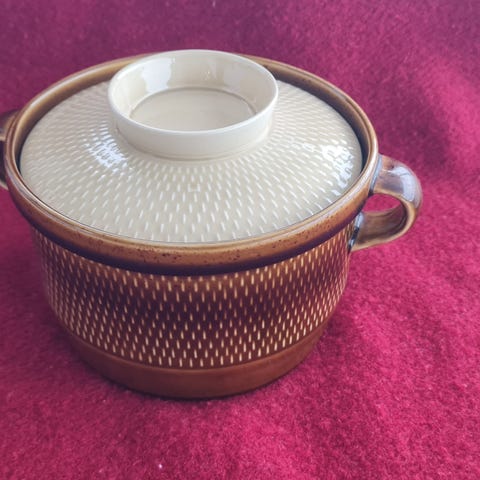 Nydelig vintage sukkerskål fra Villeroy & Boch. Modellen heter Biarritz og dekoren Bern, og sukkerskålen er hel og fin med nydelig glans i glasuren. Den er 8 cm høy med lokk, åpningen er 7,5 cm i diameter og den er 18,5 cm lang inkl hankene. Produsert i Saar protektoratet (nåværende Saarland i Tyskland) som eksisterte fra 1947-56.