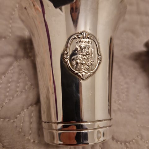 Høyde 17 cm, diameter 8,5 cm. Sølvelegget er slitt flere steder.