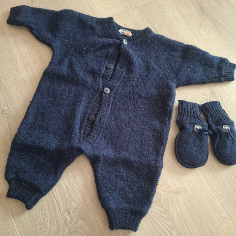 Hjemmestrikket dress og ullsokker. Dressen ble brukt av oss da jentungen var ca. størrelse 74-86.