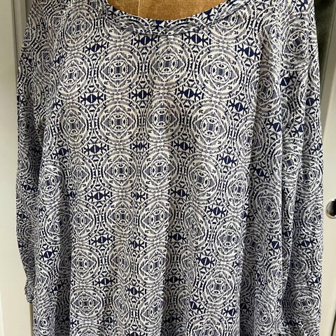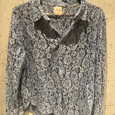 Svært lite brukt bluse til dame, artig fasong med litt flaggermusarmer og bred mansjett ytterst på erme. Lenger bak enn foran.