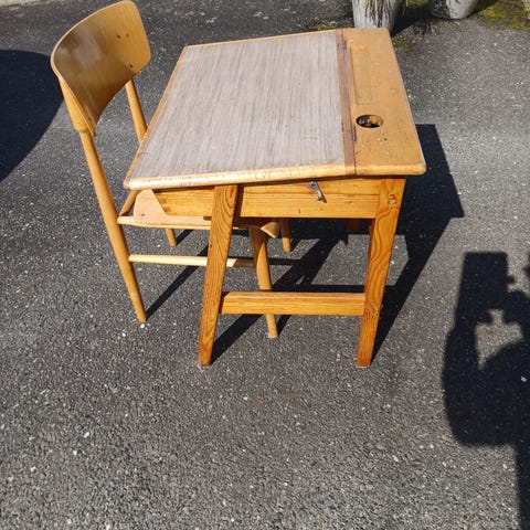 Gammel dobbel skolepult selges pga plassmangel. Barna har brukt den for å sitte sammen med venner og tegne. Praktisk hylle under begge pultene. De fleste gamle skolepulter er enkle, så dette er en sjelden skatt.