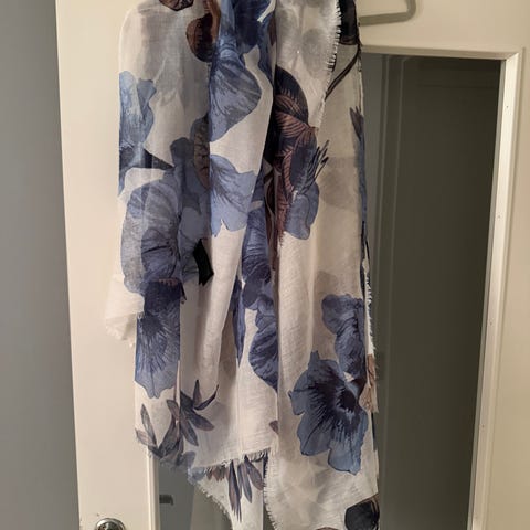 20% silke og 80% viskose, flerfarget mønster. Ca91 cm bred og ca 180 cm langt