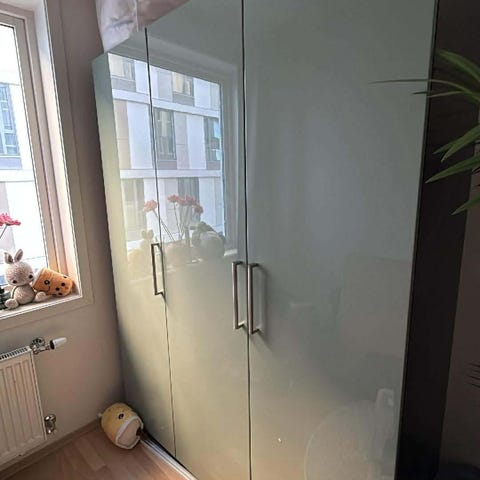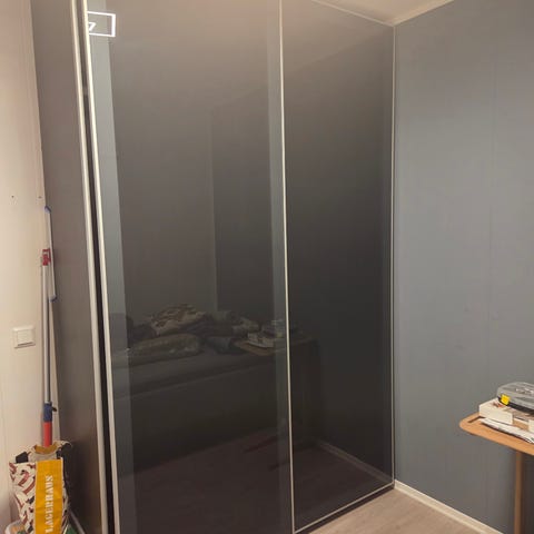 PAX-garderobe med garderobestang, trådhyller og skuffer. Dempet lukning.