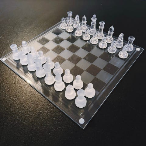 Sjakkbrett i treetui med komplett sett brikker i krystall