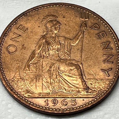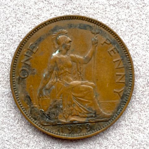 Britisk 1 penny fra 1903, med kong Edward VII på forsiden og Britannia på baksiden.