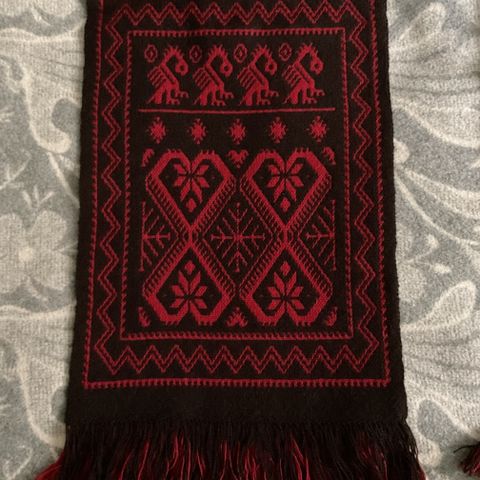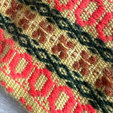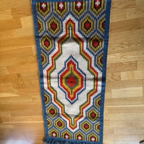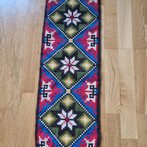 Håndlaget åkle med tradisjonelt mønster i flere farger, laget av ull. Teppet har en rektangulær form og er egnet for dekorasjon på vegger. Detaljerte mønstre i rødt, grønt, hvitt, og svart gir et klassisk utseende. Perfekt for å tilføre varme og tekstur til ethvert rom.