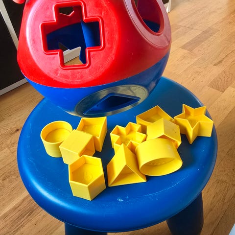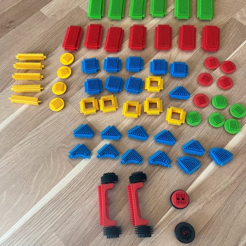 Morsom, pent brukt kvalitetsleke for baby/små barn. 5 slags kjegler som man kan leke med og putte oppi hullene. Den store boksen med hullene gynger, og har «plingelyd». Kjeglene er gode å holde i for små barnehender. Kan snurres og lekes med.