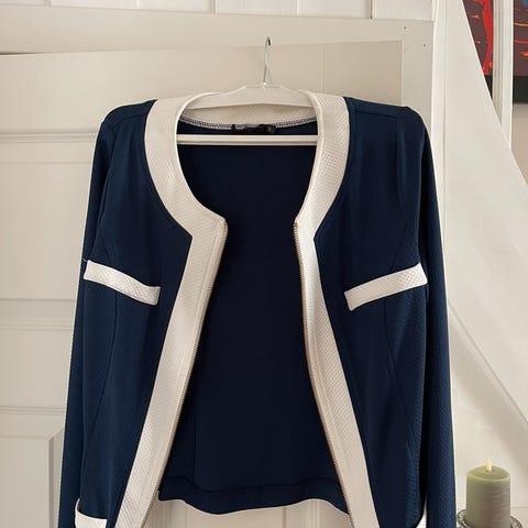 Marineblå dressjakke str. 52 selges kr 150. Mykt casual stoff.