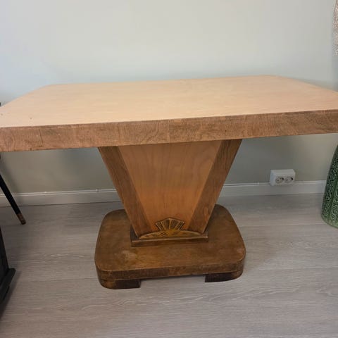 Eldre bord med 2 stoler i god stand. Bordet har noen hakk i selve bordplaten. Alder er ukjent. Se bilder. Antatt verdi er ca 200. Henting og befaring må avtales da disse er på hytta i Eidskog. Sender ikke.
