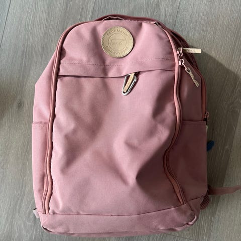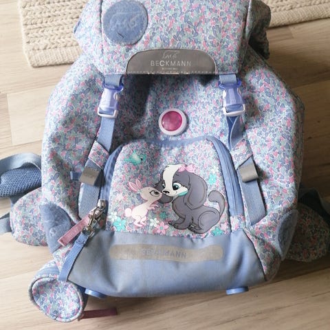 Selger en Beckmann ryggsekk til 1-2 klassing. Den er hel og fin men med noen slitasjemerker. Følger med regn/refleks trekk.