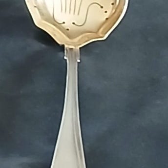 En helt spesiell og veldig fin gammel sukkerskje fra det historiske danske Godset Overgaard. Stemplet med 'Overgaard' bak og årstallet 1955. Kjøpt i sin tid hos antikvitetshandler, lengde ca. 14 cm. Tenker dette er Sølvplett, da det ikke er stemplet 925. Vakkert patinert, se bilder for stand.
