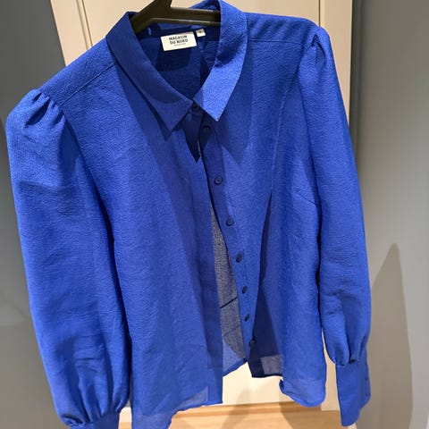 Helt ny skjorte/bluse fra Magasin du nord. Nydelig, skimrende stoff. Sort, det første bilde i blå er lånt for å se den på. Puffermer og flott snitt