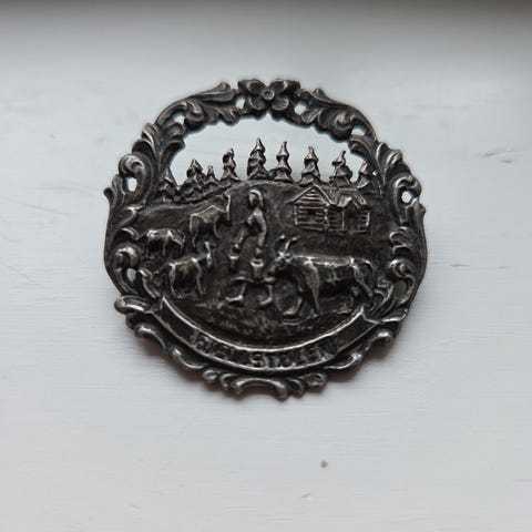 Eldre brosje i tinn. Kan sendes mot porto og omkostninger.