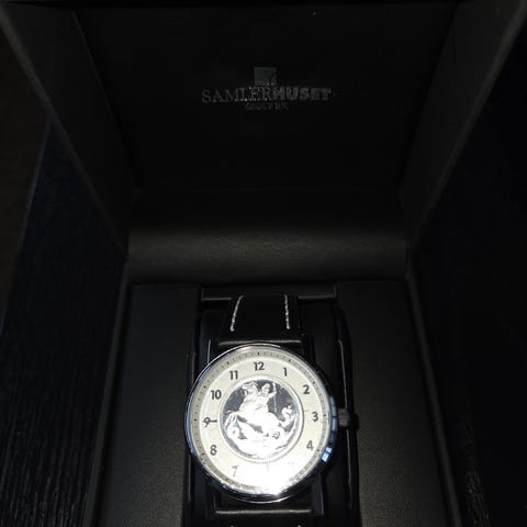 Ny Emporio Chronograph klokke. Blå, sølv og hvite detaljer, blått lær bånd og med hvit skive.