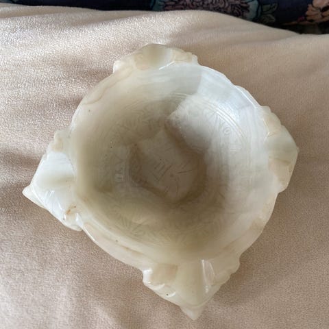 Hvit bunn med striper i grønn og rød oker. Rød oler innvendig.