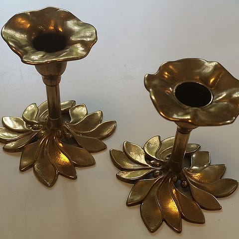 Messing lysestake i blomst design. Høyde er passende for standard stearinlys. Den har et elegant blomstermotiv med blad og er laget av messing for et klassisk utseende. Perfekt som dekorasjon i stue eller spisestue.
