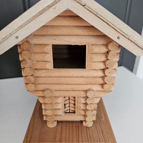 Fint eldre stabbur i treverk med plass til fyrstikker. Det er etset inn Tuddal nederst. Det er ca 8cm høyt og 12cm bredt. Rommet inni måler ca 5x4cm. Det er plass til løse vanlige fyrstikker. Ikke en hel eske.