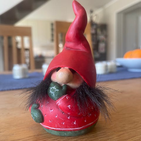 Koselig liten nissefigur i keramikk, perfekt som julepynt eller helĂĽrs dekor for deg som liker nordisk stil â¨