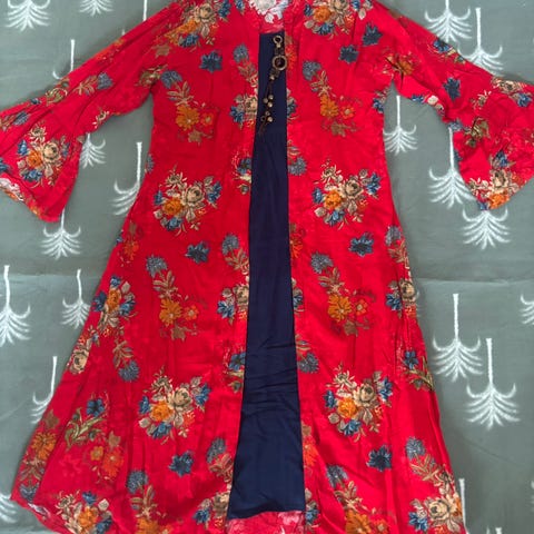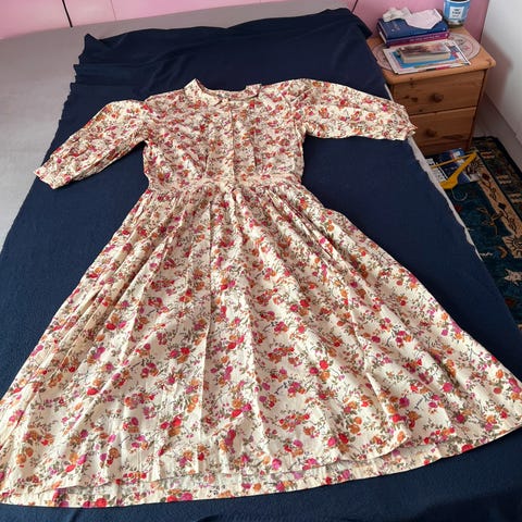 Nydelig sommerkjole i behagelig stoff. Fine blomster detaljer med volanger. Belte snor så den kan strammes inn. Strikk i livet. Lengde ca . 119cm
