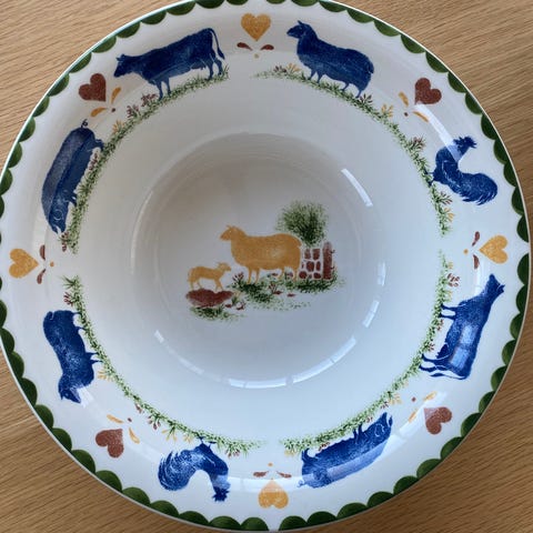 Serveringsfat L: 30 cm D: 24,5 cm til serviset Jack’s Farm fra Wood&Sons. Made in England. I fin stand, har en liten blå prikk under motivet som stammer fra produksjonen, friske farger og blank glasur. Kr. 400,-