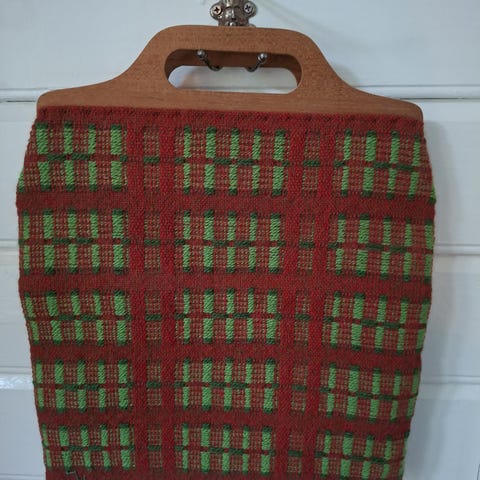Tøff veske av kordfløyel og hanker av tre selges. Vesken er fin stand. Se bilder for detaljer og mål.