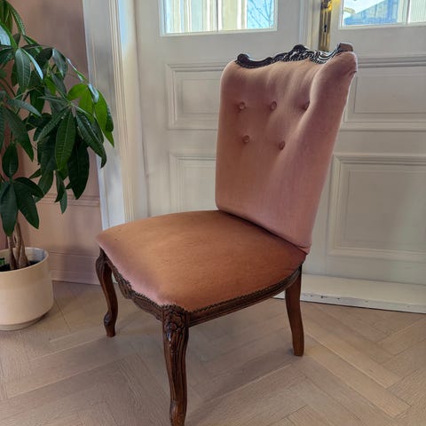 Flott gammel stol som er trukket om hos møbelsnekker i slitesterkt stoff.