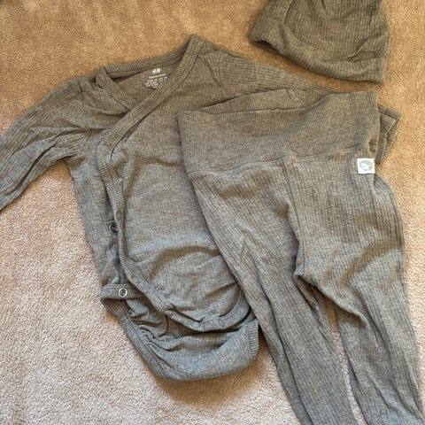 Søtt sett fra HM i grått med hvite skyer. Body, bukse og lue. Alt I bomull, mye bruk igjen.