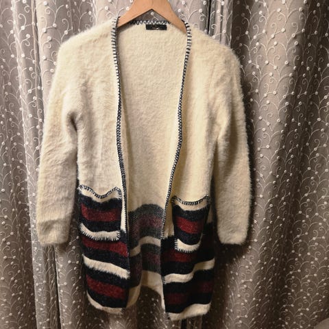 Ubrukt jakke/cardigan str.L selges. Hekter i halskant og lommer nede på begge sider. Lett og deilig stoff. God lengde som går godt nedenfor baken.