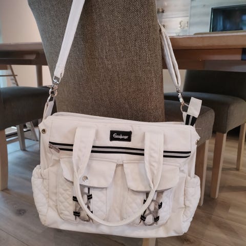 Stor og praktisk BeBeJu stelleveske som er brukt til et barn. Veldig mange praktiske lommer og rom og stellematte. Den er vasket før salg.