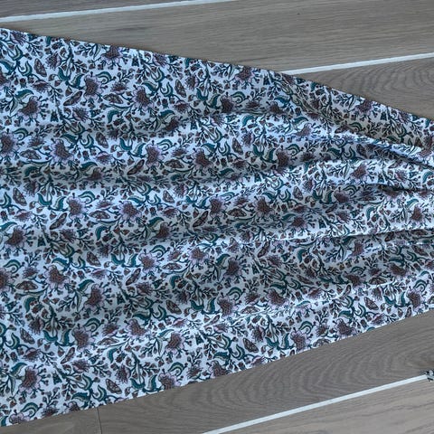 Forkleet er i lin/bomull. 74 cm langt mål øverst ved foldene er 33 cm