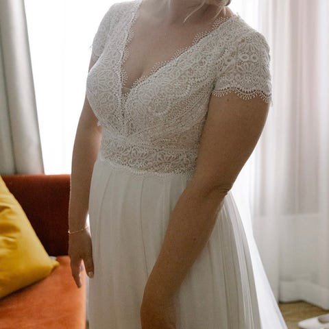 Kjolen er i størrelse 36, men ble skreddersydd i brystpartiet til brudens mål (75/80b i bryststørrelse)