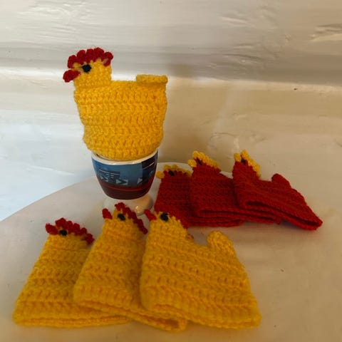 Søt kyllingpynt. Fylt med fiberfyll og litt erter for tyngde. Må derfor ikke bløtlegges og vaskes!