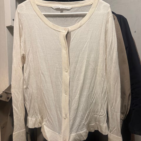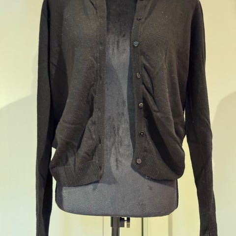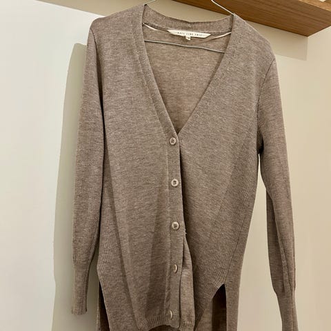 Deilig cardigan i 100% merinoull, grå. Splitt i siden. Den er i god stand, men liten flekk på baksiden (se bilder).